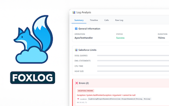 FoxLog is een krachtige Chrome-extensie die de analyse van Salesforce debug logs vereenvoudigt. Dit gratis hulpmiddel biedt een gebruiksvriendelijke interface voor het visualiseren van Apex logs, waardoor ontwikkelaars snel en eenvoudig inzicht krijgen in hun code. Met functies zoals real-time visualisatie en automatische foutdetectie kunnen gebruikers problemen snel identificeren en oplossen. Het biedt vier complementaire weergaven: samenvatting, tijdlijn, hiërarchische oproepstructuur en ruwe logbestanden, die helpen bij een grondige analyse van de prestaties en foutopsporing.
